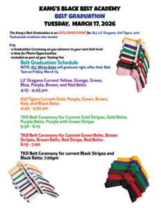 Kang's has a good, healthy training environment, with a good number of very engaged black belt level students who have remained, and who do a lot to make new students feel welcome, and who serve as mentors to the colored belt students.